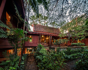 미국의 사업가인 짐 톰슨은 2차 세계대전 종료 후 태국에 정착하며 1950년대부터 1960년대에 걸쳐 태국의 실크 산업을 부흥시키는 데 큰 역할을 했습니다. 또한 그는 태국 문화를 사랑하여 1959년에는 태국 문화를 주제로 한 집을 건설했습니다. 그러나 1967년 3월 26일 말레이시아의 캐머론 고원에서 실종되었고, 그의 이야기는 그림자처럼 '전설'로 남아 이 집은 박물관으로 개방되어 그의 동남아 각지에서 수집한 다수의 유물들을 전시하고 있습니다.